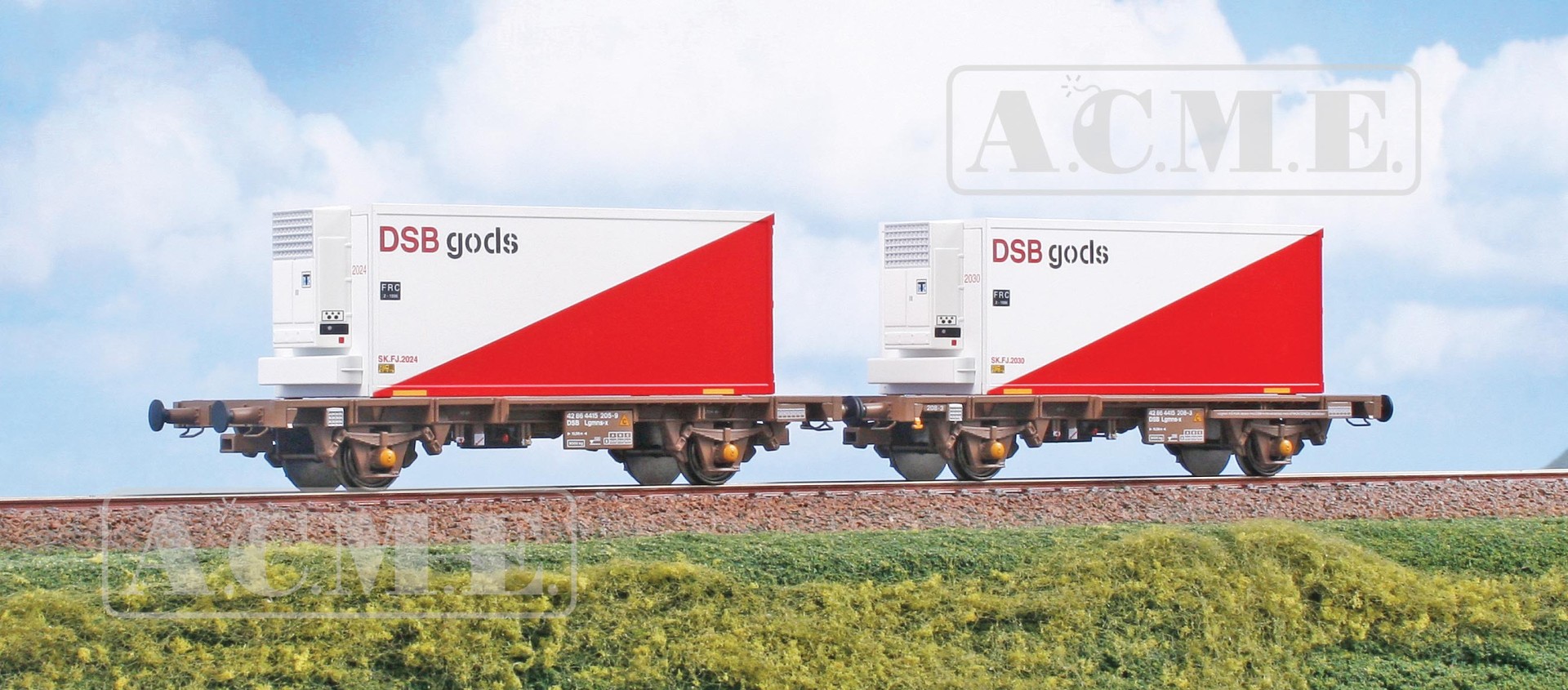 Sæt med to vogne som er læsset med DSB kølecontainere.